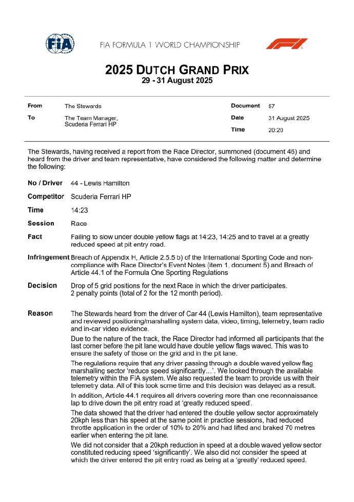 我们认为在双黄旗区域减速20公里/小时不构成“显著”减速。此类判罚原本应当被罚10位,但考虑到车手有主动减速,所以给了5位处罚。”