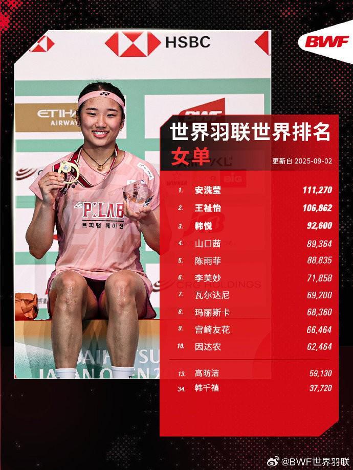 女单方面,安洗莹继续排名第一,王祉怡、韩悦分列二三,陈雨菲排名世界第五。