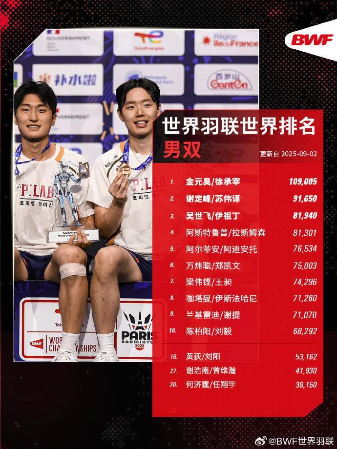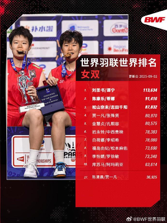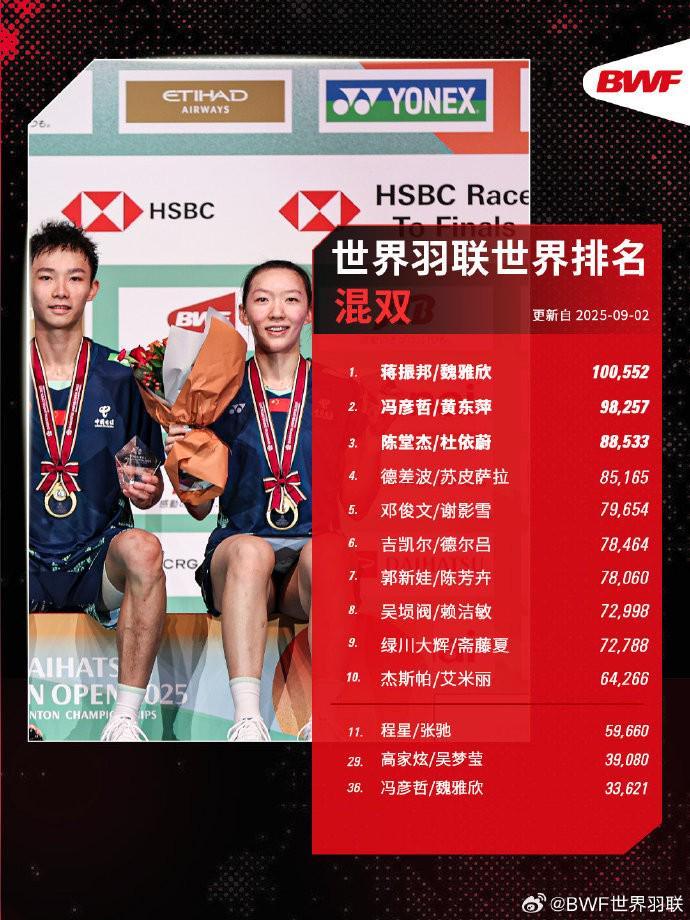 9月2日,世界羽联更新2025年第36周世界排名,世锦赛后世界排名发生变更,蒋振邦/魏雅欣重回混双世界第一,石宇奇、安洗莹、金元昊/徐承宰、刘圣书/谭宁继续领跑各单项第一。