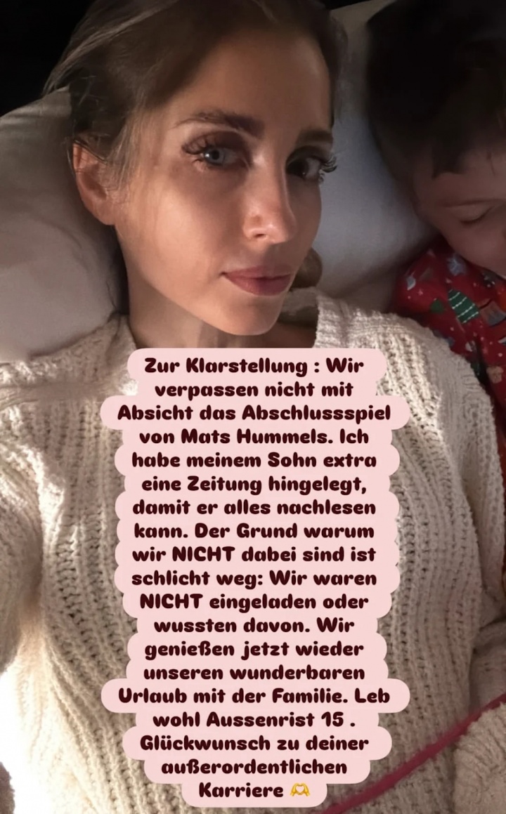 凯茜在一篇帖子中写道:“澄清一下,我们不是故意错过胡梅尔斯的告别赛,我还拿了一份报纸给孩子看看比赛内容。我们没去的原因很简单,那就是我们没被邀请,甚至不知道这件事。”